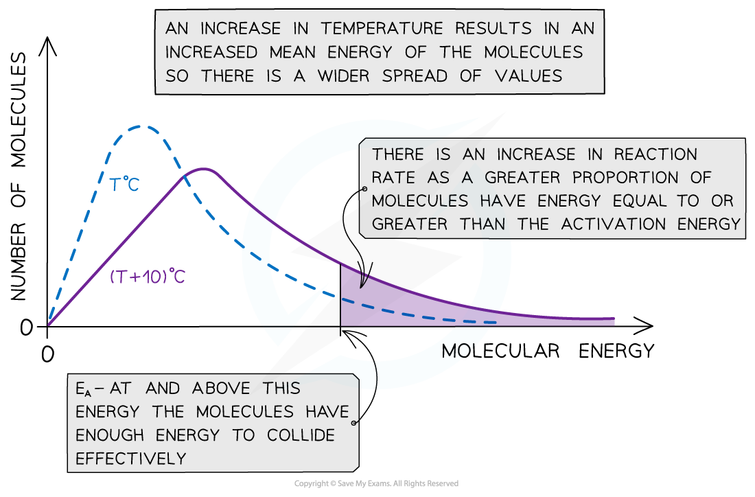 lowers activation energy by providing an alternative route = more particles with the greater energy than the activation energy = more successful collisions in a given time