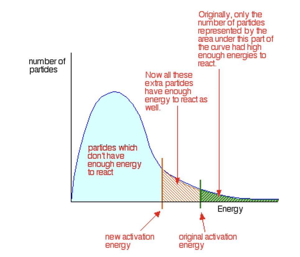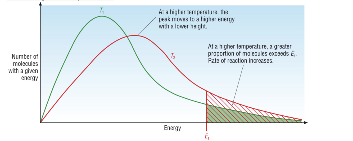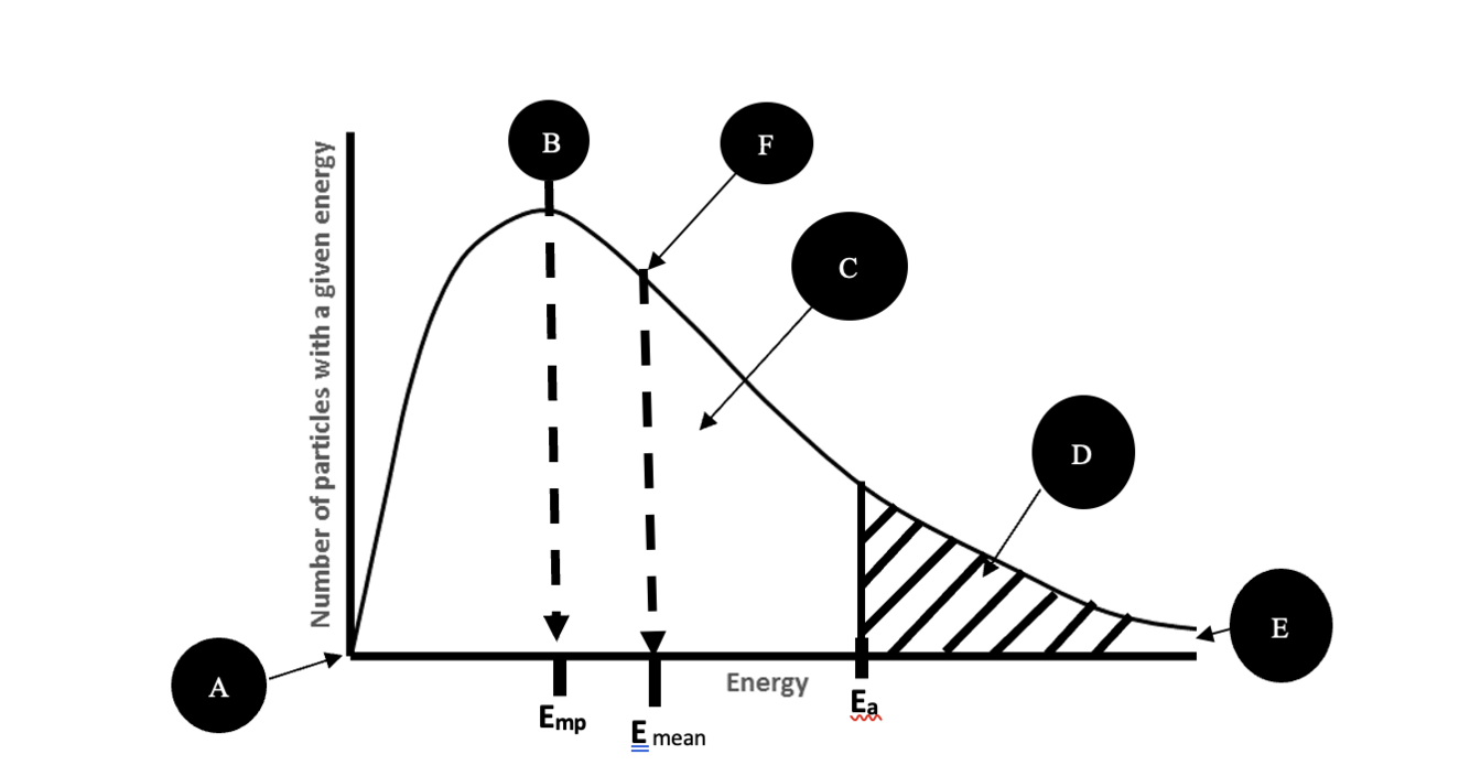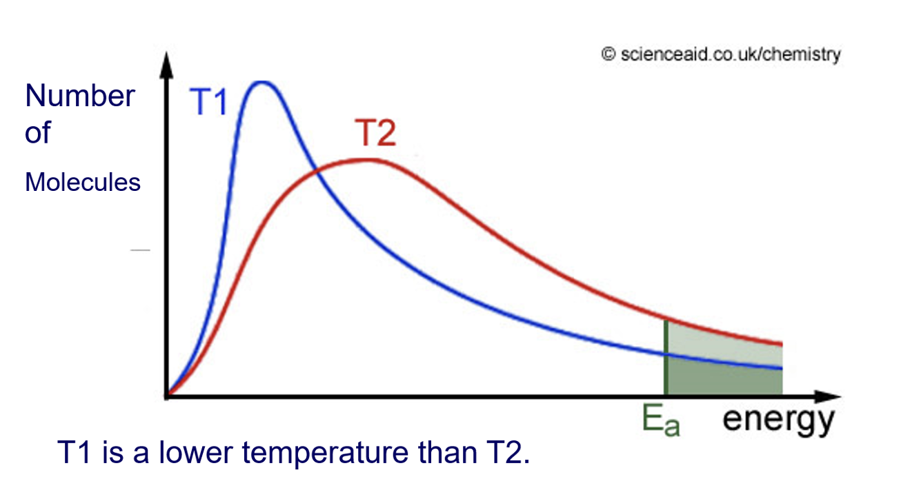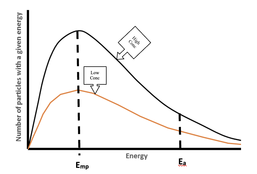 The distribution shows that only a small fraction of particles can collide with enough (E≥Ea) to start a reaction/break bonds