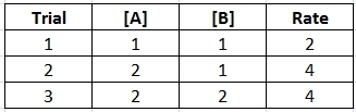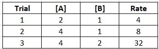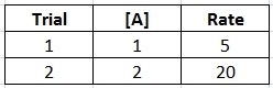 To determine the reaction order for A, see how varying [A] affects the rate. Between Trials 1 and 2, [A] increases by a factor of 2, and the rate increases by a factor of 4.