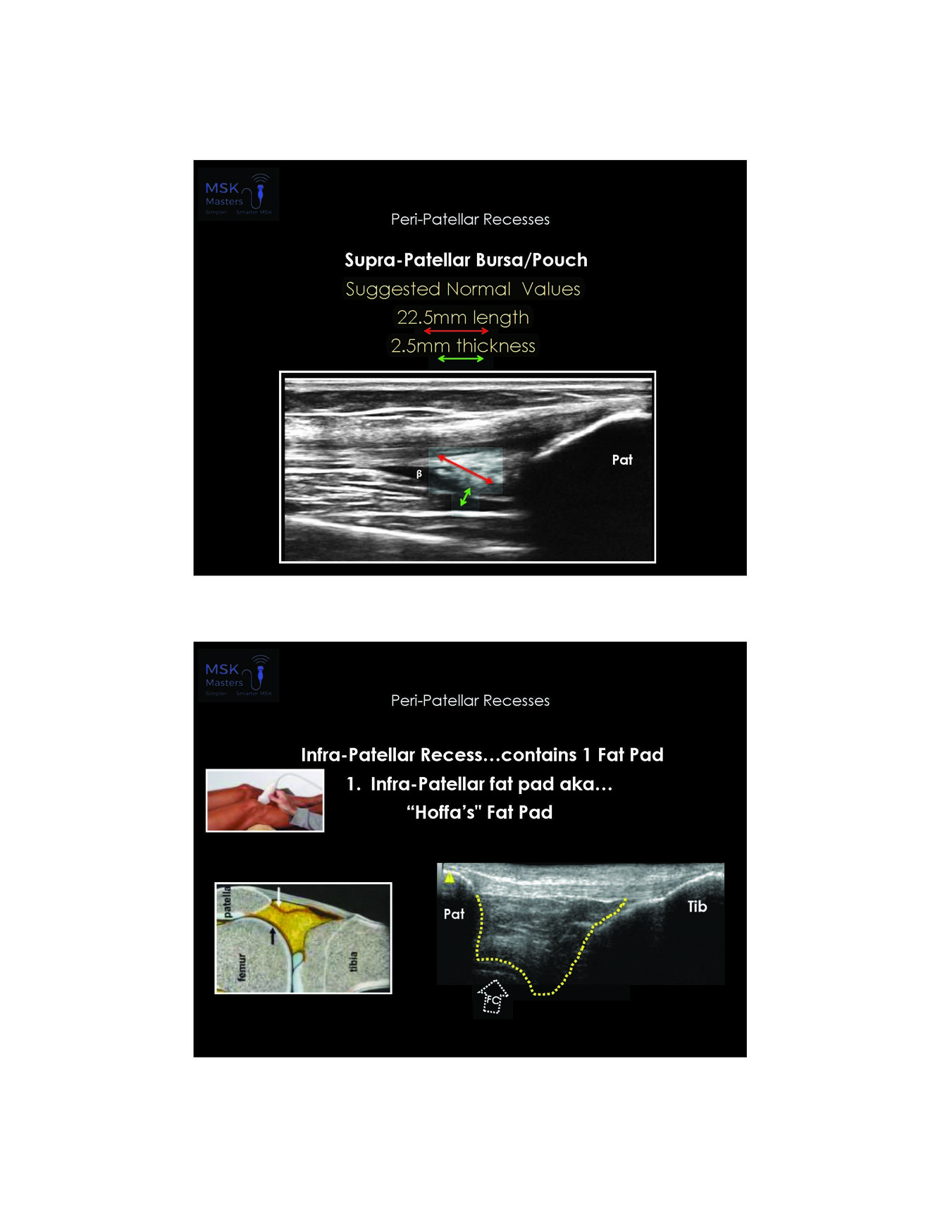 What is the suggested normal for supra patellar bursa length and thickness