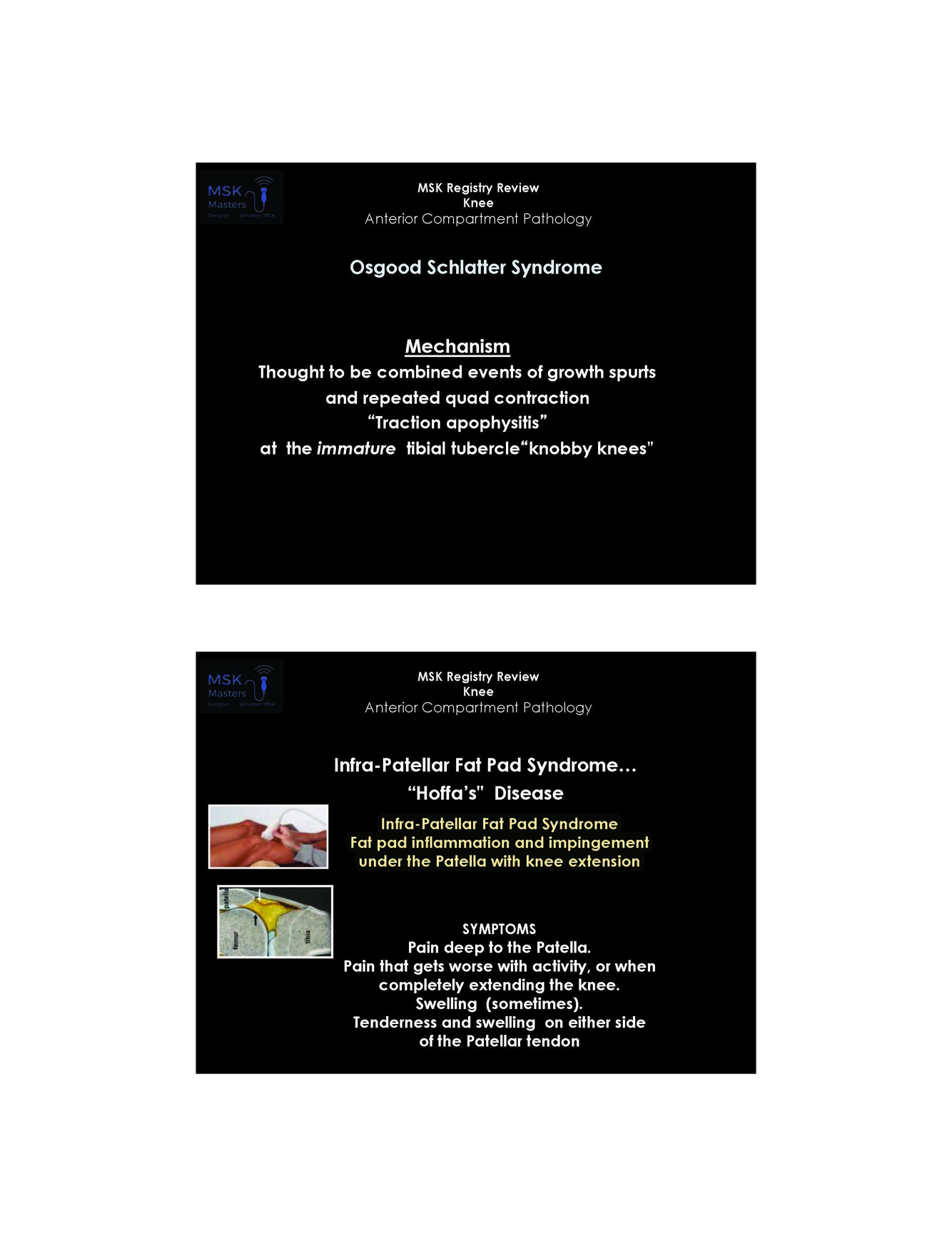 Irritation of Infra patellar fat pad. What are some of the symptoms?