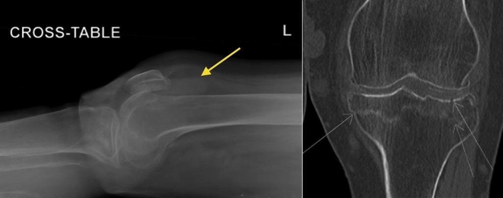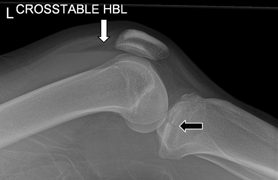 You will notice that there is a very straight line (arrow) at the superior aspect of the fluid, above which there is some low density material. This is fat floating on blood, and makes this a lipohaemarthrosis. The reason this is significant is that it means that there must be an underlying fracture, even if one cannot be seen on the radiograph (because the fat is actually marrow fat, and must have leaked into the joint through a fracture).