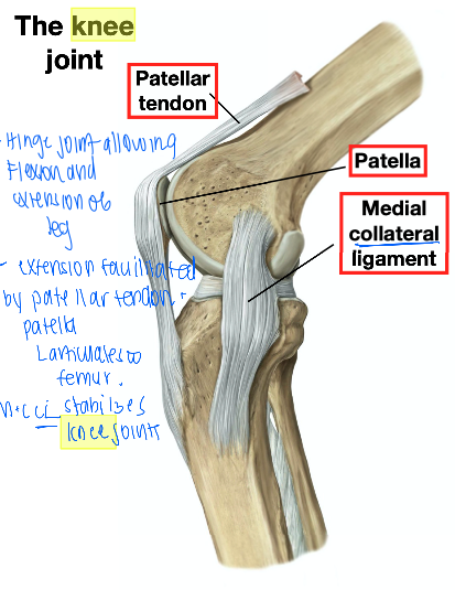 extension is facilitated by the patellar tendon and patella that articulates with the femur.
