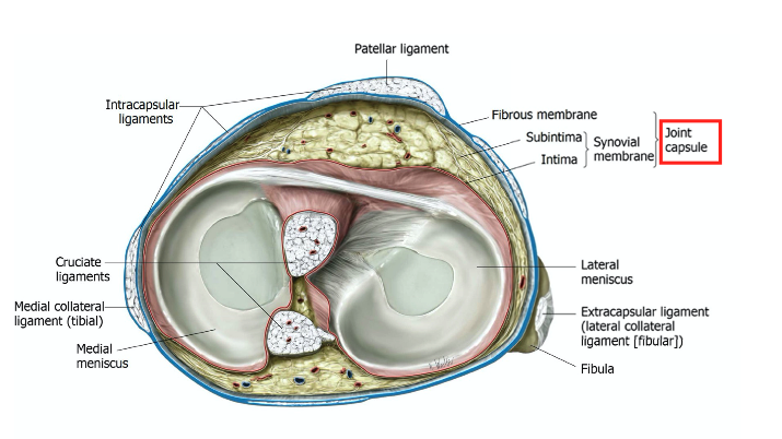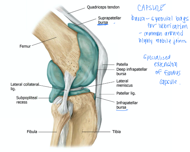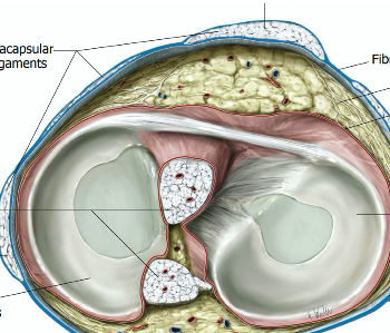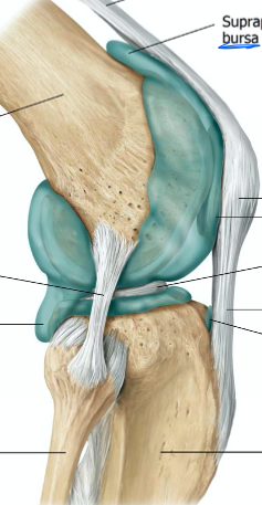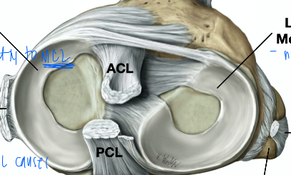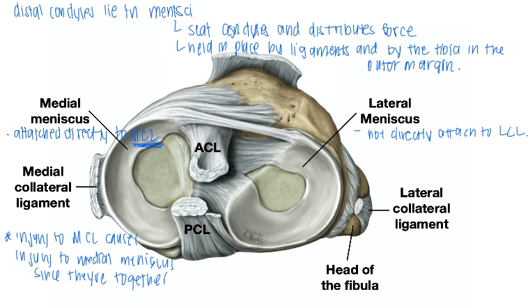 the distal condyls of the femur line in MENISCUS that seats the condyles and distrbitues force. they are held in place by LIGMANETS and by the TIBIA in the outer margin
