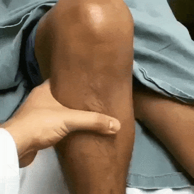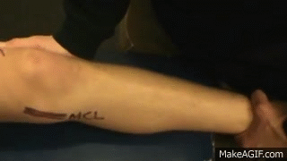 Anterior drawer sign: bend knee at 90° angle and draw tibia forward. Forward movement is greater than normal in ACL tear