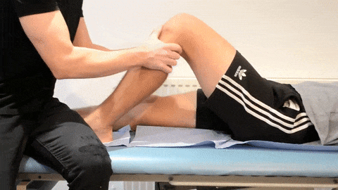 → External rotation tests medial meniscus and internal rotation tests lateral meniscus. Medial meniscus test shown