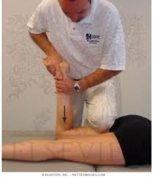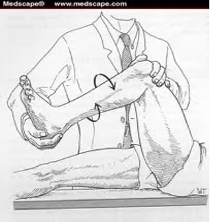 Examiner stabilizes the posterior thigh while compressing the through the heel and rotating the leg