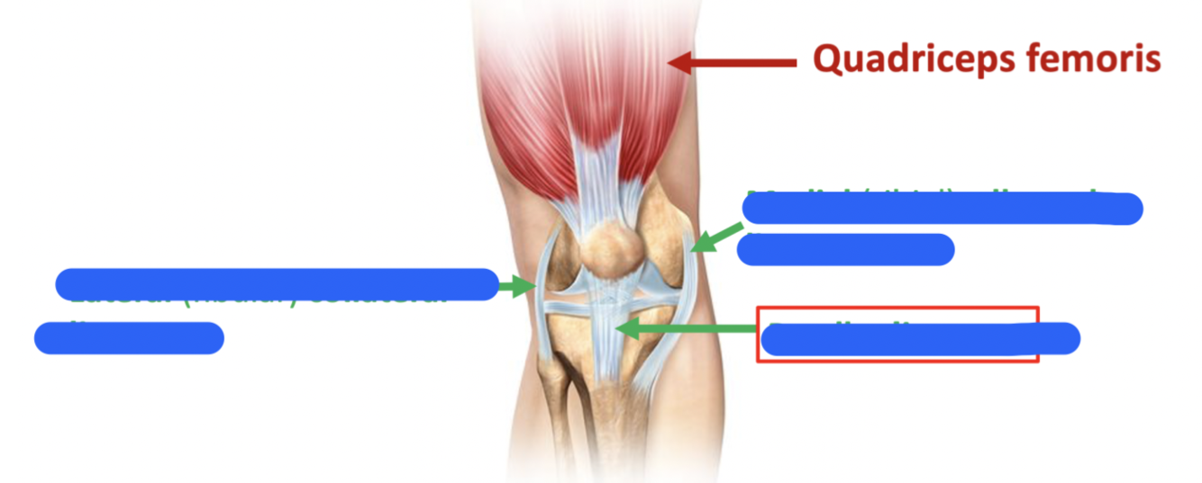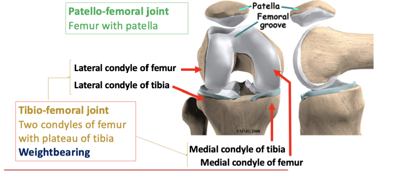 Tibia -femoral (lateral comndyle of femur- lat condyle tibia, medial condyle of femur- medial condyle of tibia- weight bearing