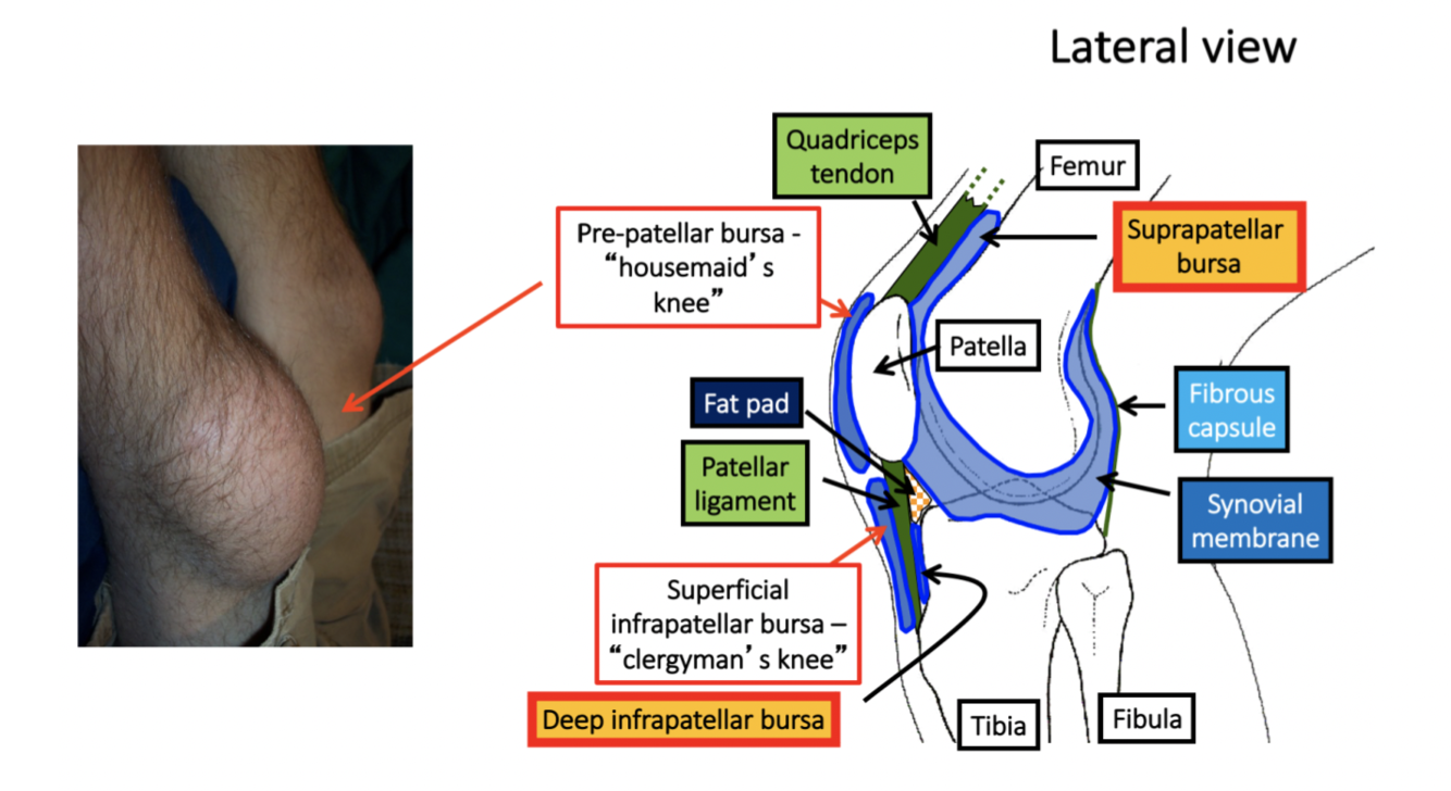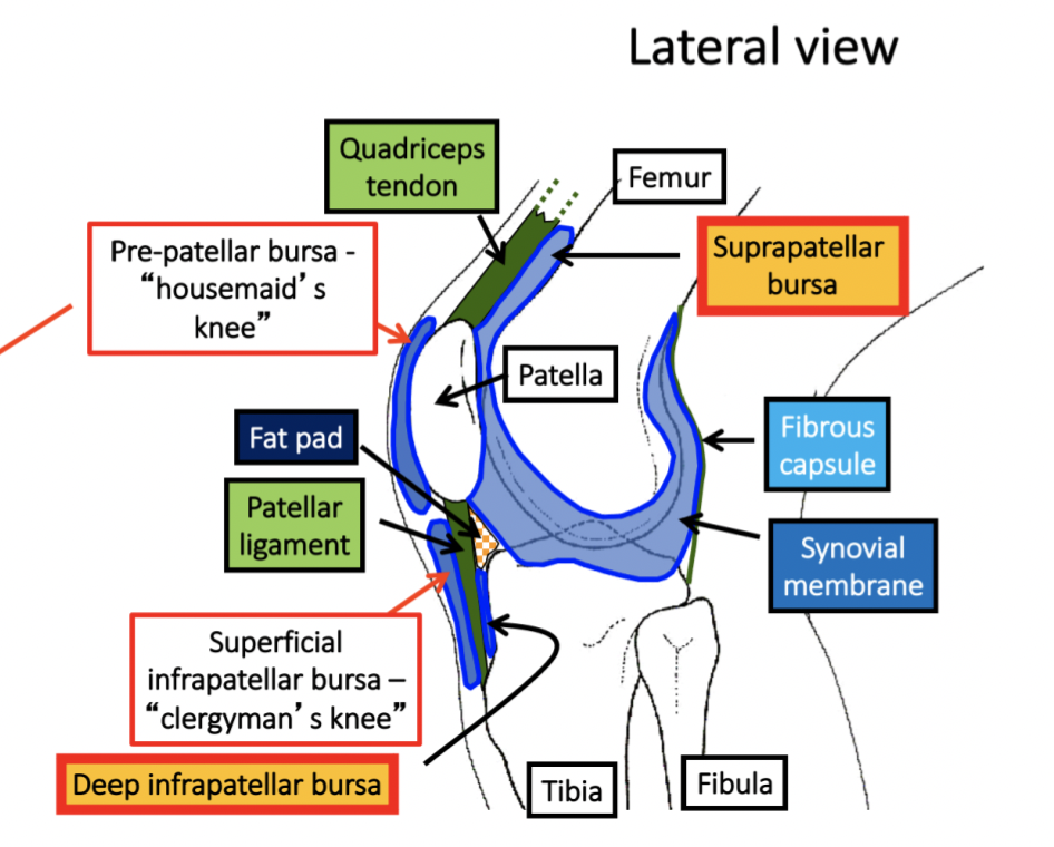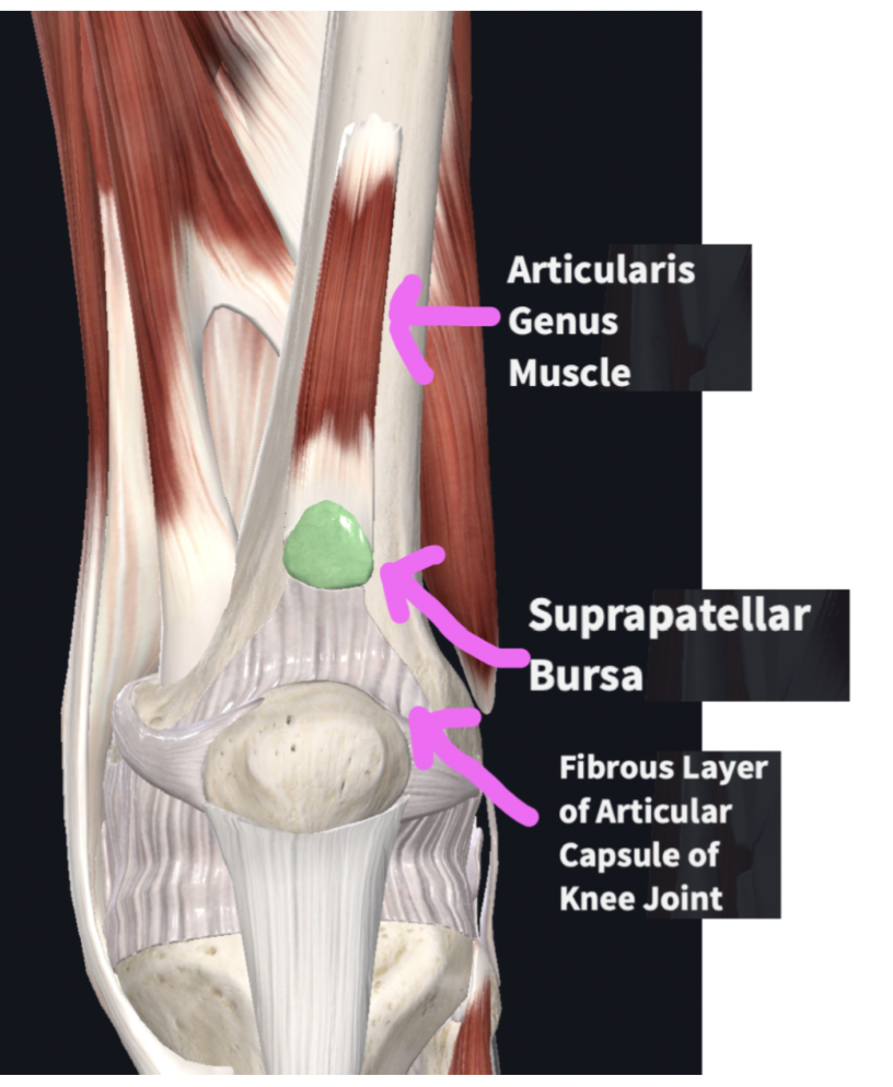 is attached to the articularis genu miuscle (pulls the suprapaetall burs superiroly during extension)