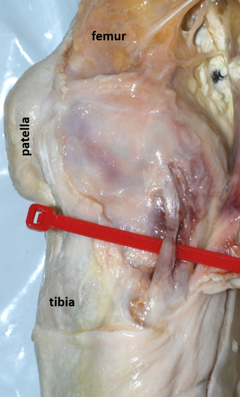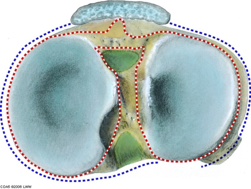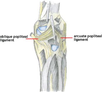 Encloses the intercondylar fossa of the femur. Open posterior to the lateral condyle of the tibia for the popliteus muscle (blue line)