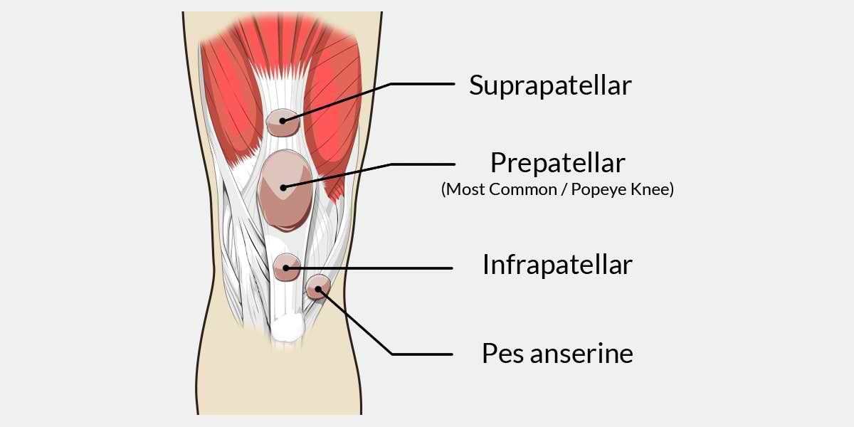 Suprapatellar Subcutaneous prepatellar Subcutaneous infrapatellar Gastrocnemius Semimembranosus Anserine Popliteus