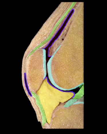 Encloses intracapsular structures: menisci, cruciate ligaments, synovial membrane