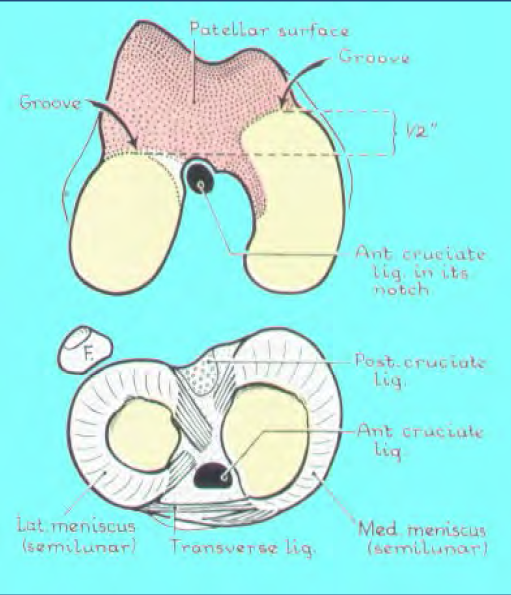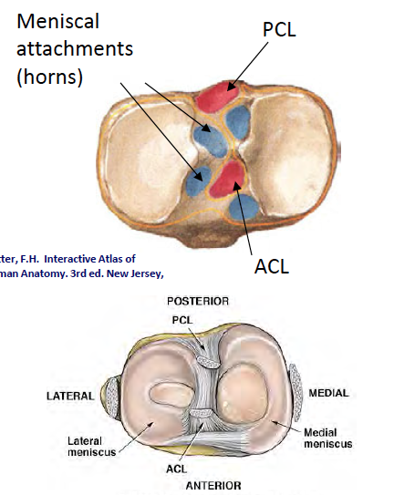 ACL: attaches anteriorly on the tibia, and lateral condyle of the femur