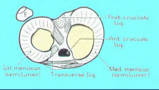 ACL: prevents tibia being displaced anteriorly to femur, or femur being displaced posterior to tibia when weight bearing