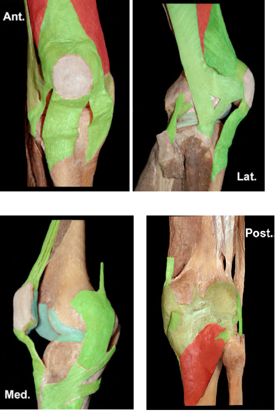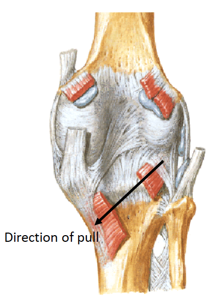 Lateral: popliteus, biceps femoris, iliotibial tract