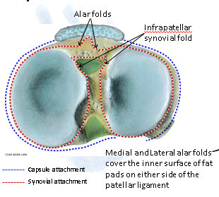Medial and lateral alar folds cover the inner surface of fat pads on either side of the patellar ligament