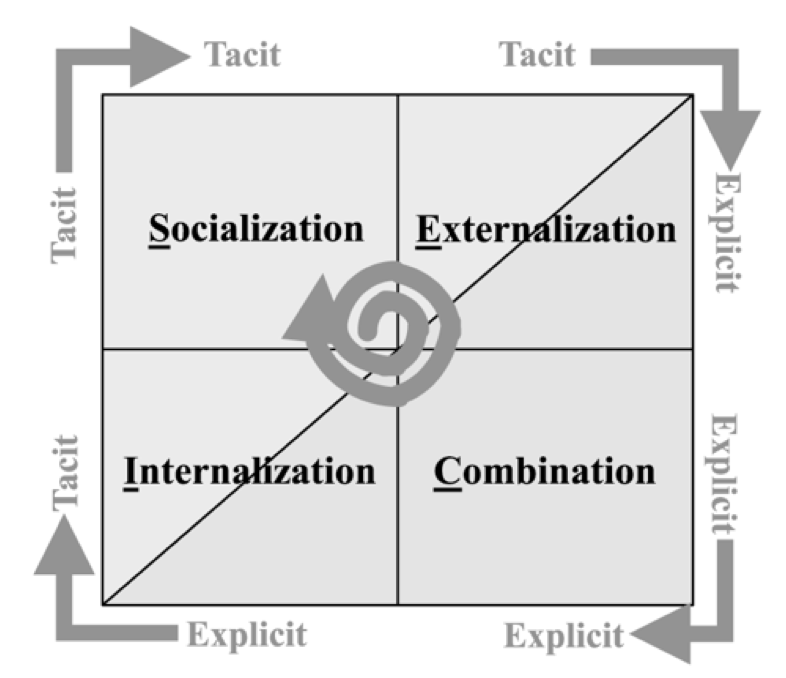 Socialization: Tacit to tacit. Knowledge is passed on through practice, guidance, imitation, and observation.