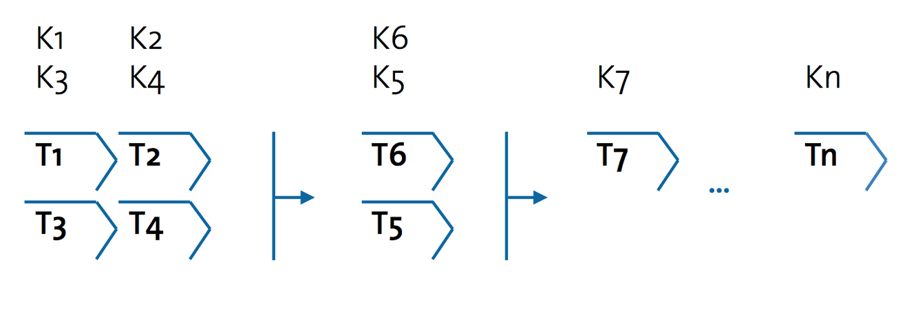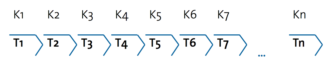 - Transformation steps ordered in a time-patterned sequence such that each specialist’s input occur independently through being assigned a separate time slot