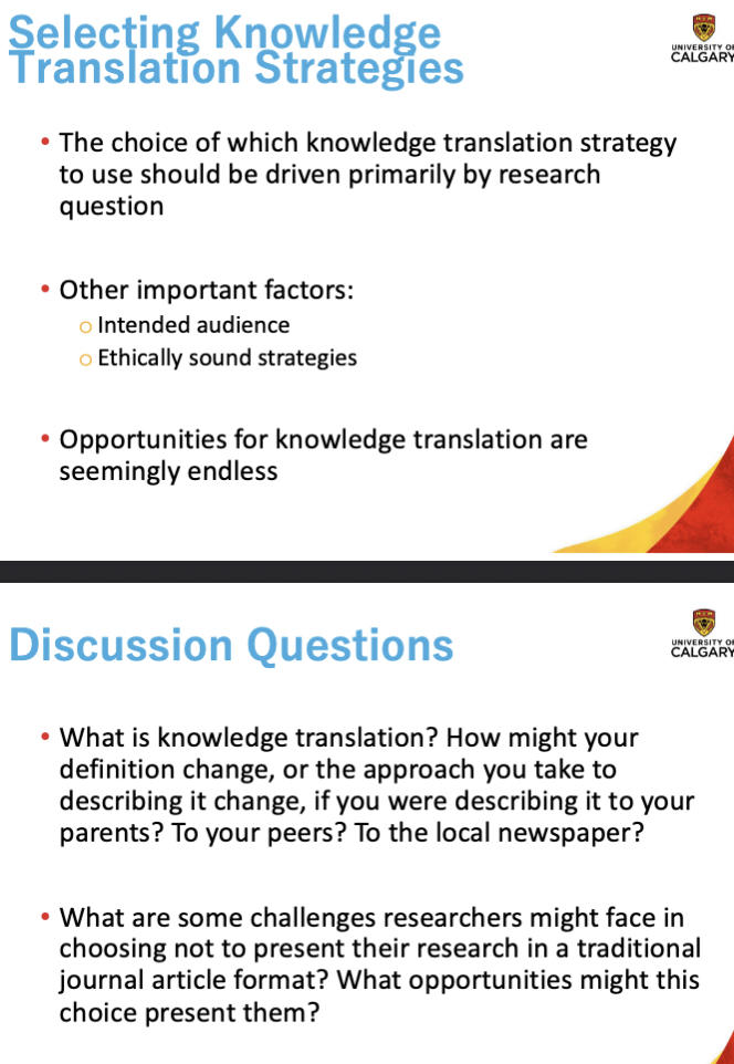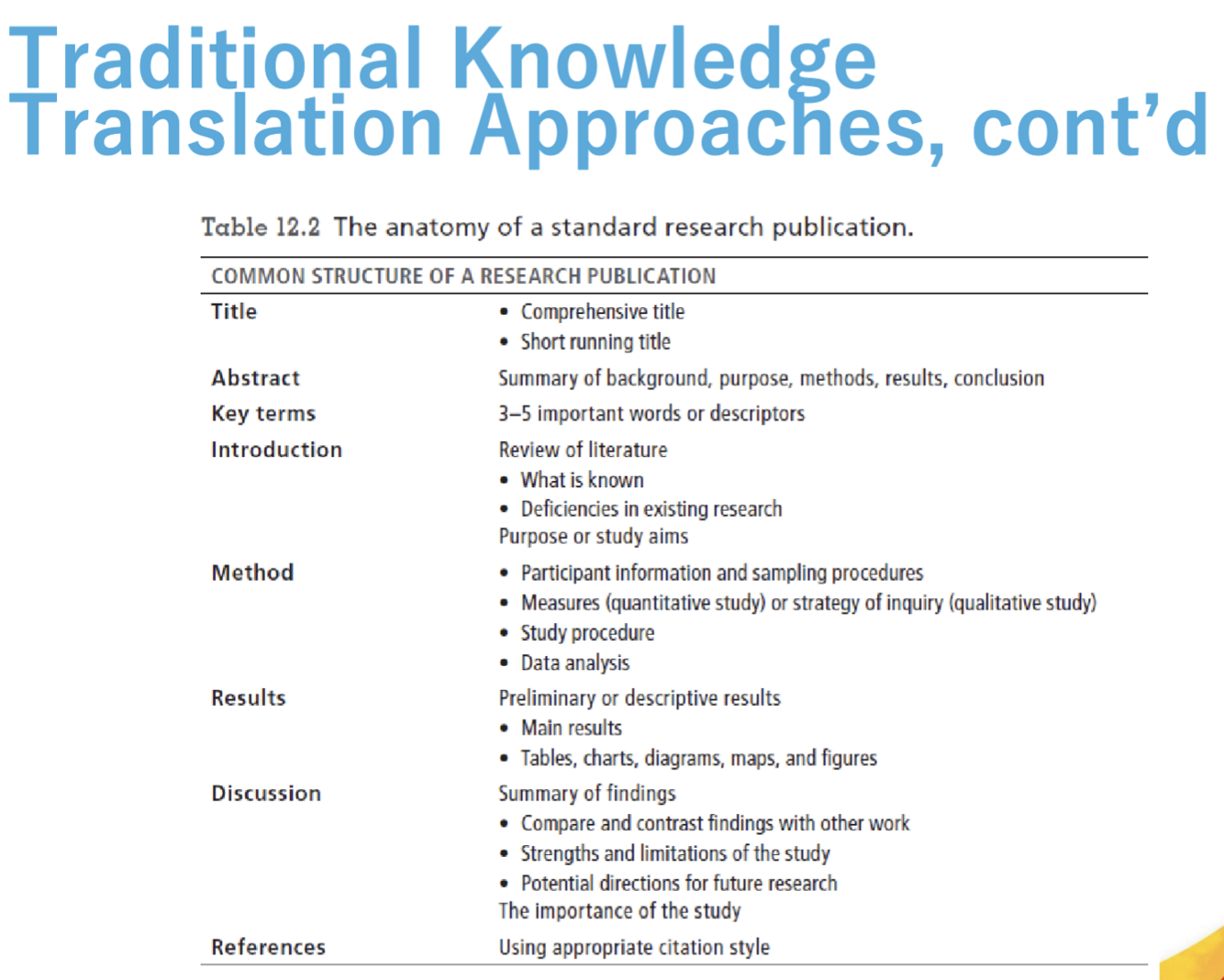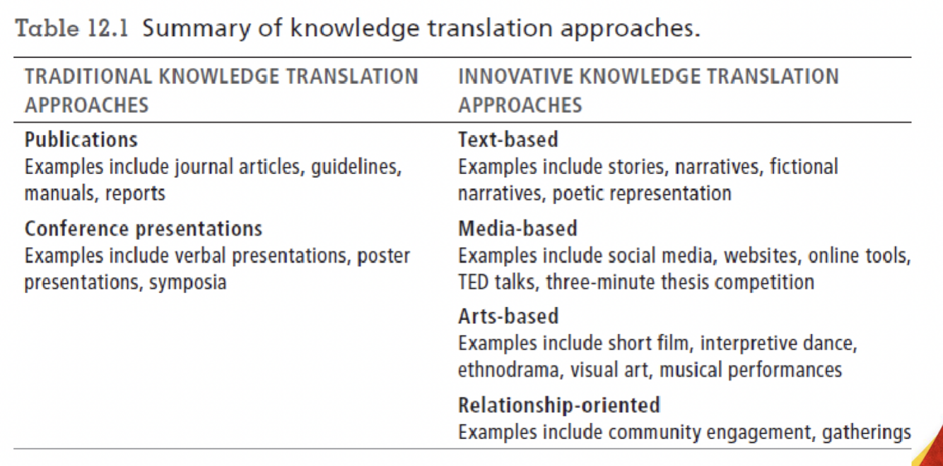 o E.g., providing summaries for knowledge users, delivering educational sessions with patients