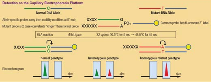 OLA consists of two stages, a PCR amplification and an OLA in a single tube format.