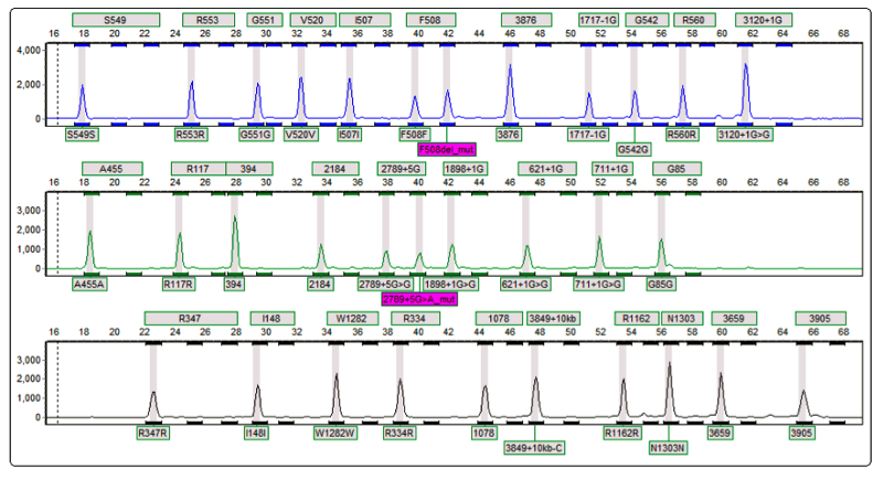 Image: A ligation product from the common p.Phe508del mutation is seen (purple box, top row), along with a product from the c.2789+5G>A mutation (purple box, middle row). This patient is a compound heterozygote.