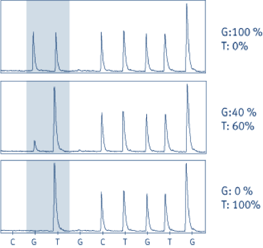 Pyrogram® traces of JAK2 analyses. The sequence read is (G/T)TCTGTGG. The shaded area indicates the mutation site. The G peak in the shaded box varies between 0 and 1 (normalized units), whereas the T peak varies between 1 and 2, since the subsequent nucleotide in the sequence is T.