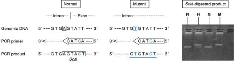 The mismatch in the primer introduces an AGTACT restriction site for ScaI into the PCR product from the normal sequence. The ScaI-digested product from homozygous normal (N), heterozygous (H) and homozygous mutant (M) patients is shown.