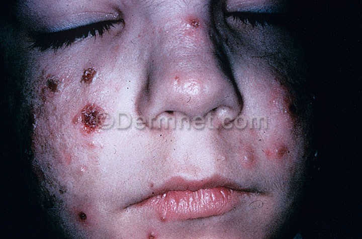 Hydroa-Vacciniforme; can be associated with latent EBV infection (there is an EBV-assoc lymphoma with similar findings); treatment is photoprotection as it is refractory to other treatments