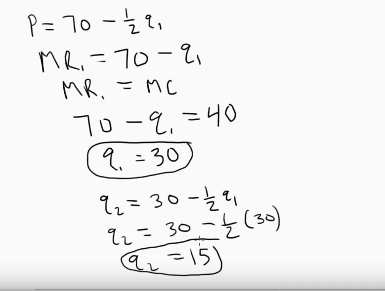 Find det når P=100-Q og Q=QL+QF. Find reaktionsfunktionerne.