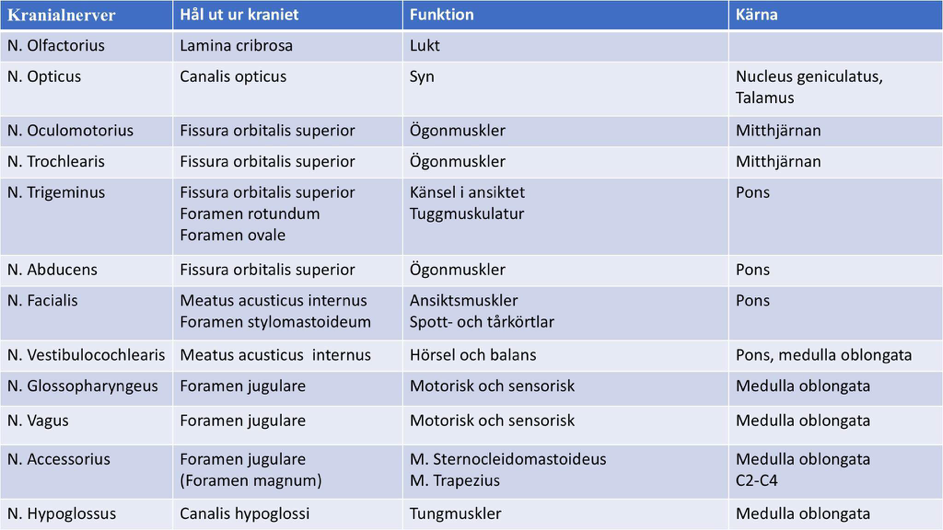 Nerverna är numrerade efter placering på hjärnan och hjärnstammen.