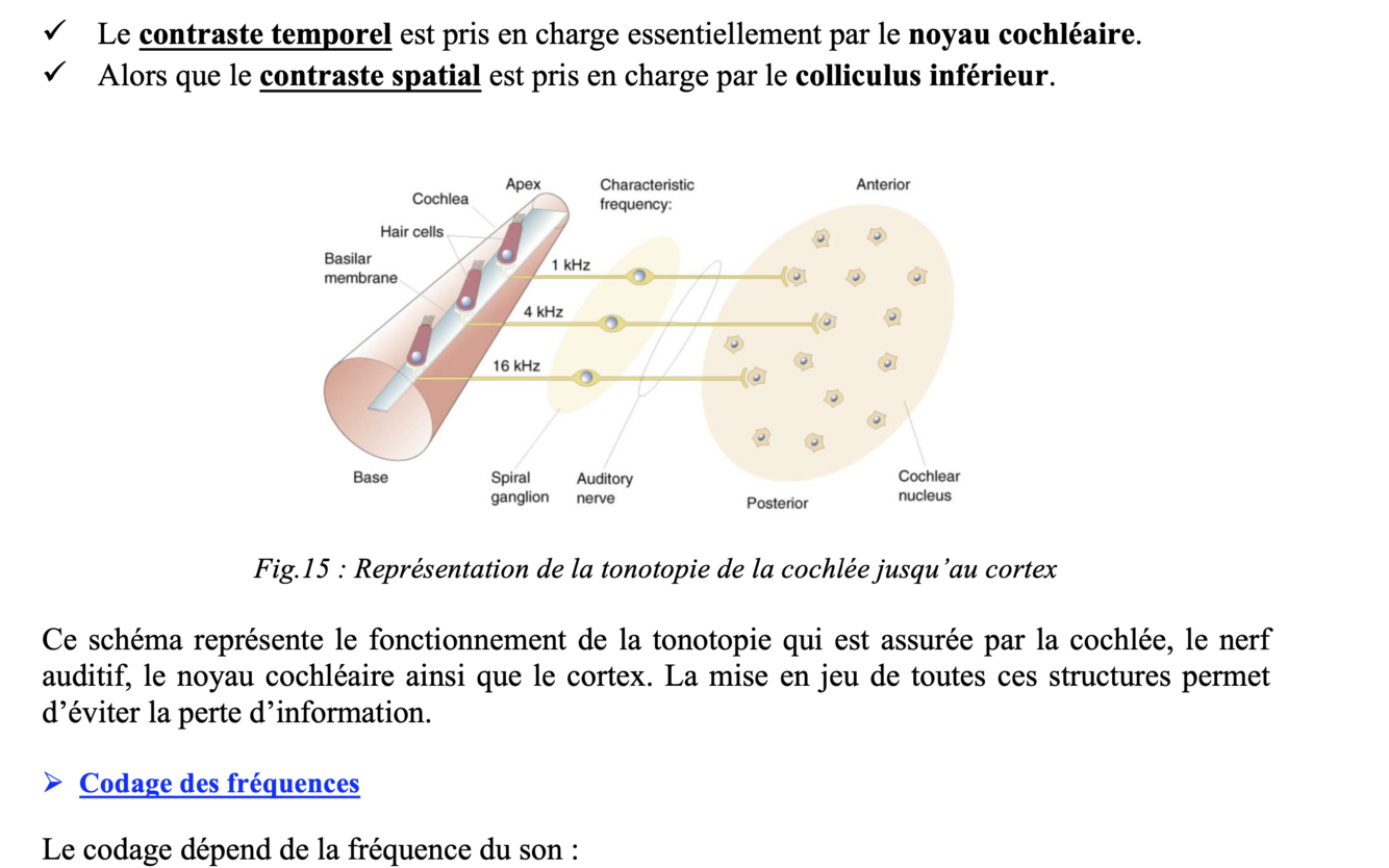 Ø Fréquences intermédiaires : codées par la tonotopie et les corrélations de phase. Ø Fréquences très hautes : codées par la tonotopie.