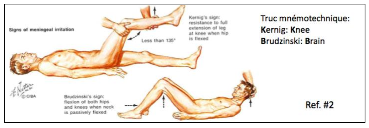 Cliniquement: Signe de Kernig et Brudzinski +