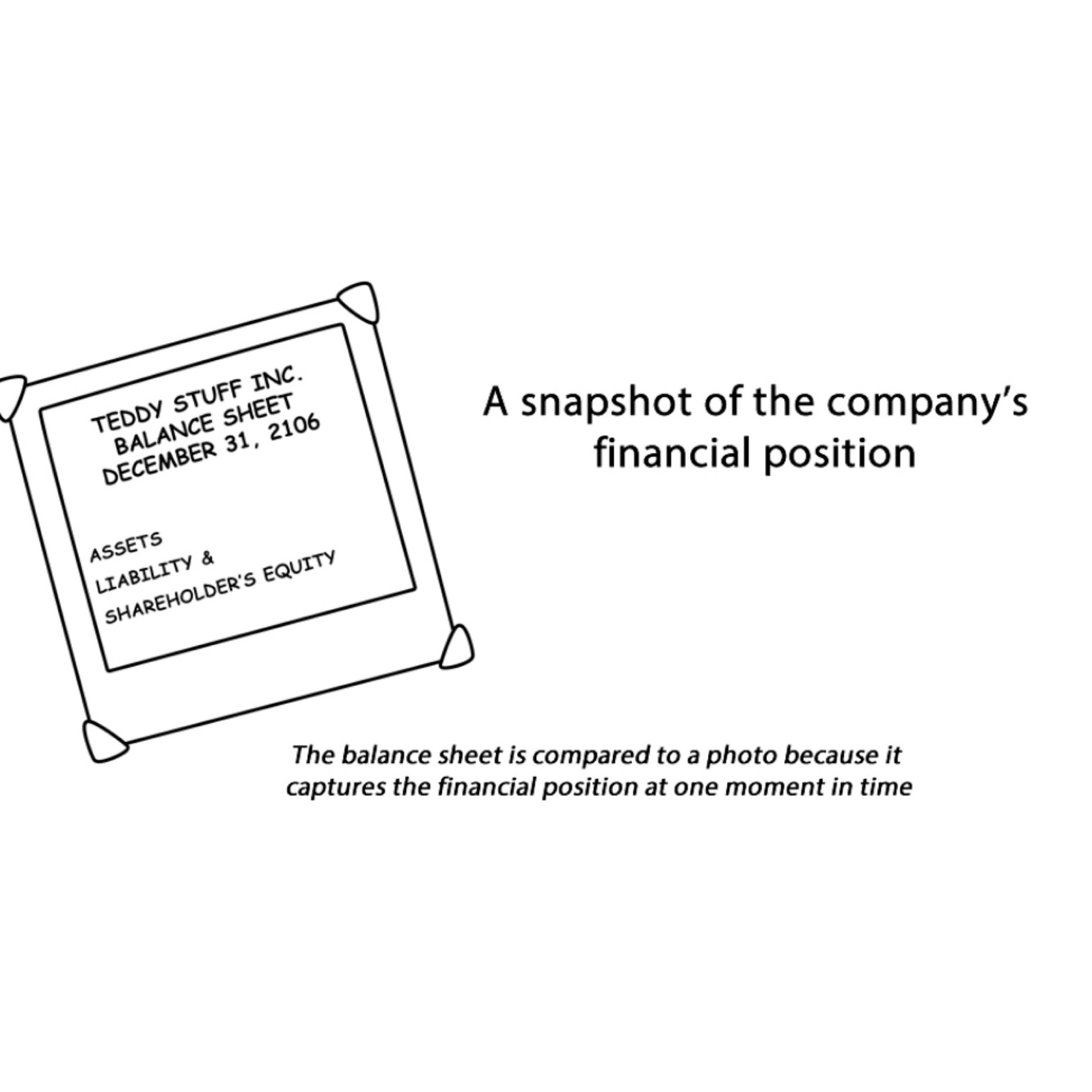 Presents the assets, liabilities and equity of a company at a given point in time.