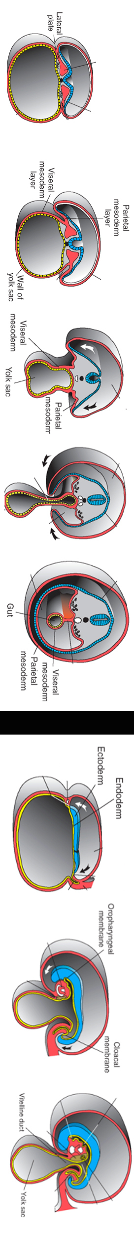 2) The trilaminar embryonic disc then starts to roll up into a tube during which both layers grow laterally and fold ventrally. Somatopleure becomes the ventral body wall and splanchnopleure becomes the gut tube. The space between them is the primitive body cavity.