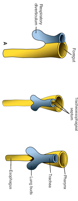 2) Soon the tracheoesophageal septum separates the diverticulum from the foregut. The ventral portion of the foregut in the throax therefore becomes the trachea and lung buds whereas the dorsal portion becomes the esophagus.