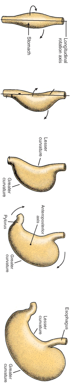 4) the stomach also rotates for 90 degrees clockwise about the anteroposterior axis resulting in the caudal part moving to the right and upward and the cranial part moving to the left and downward.