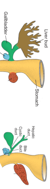 3) The connection between the liver bud and the foregut narrows to form the biliary ducts and a small outgrowth from the biliary duct forms the gallbladder.