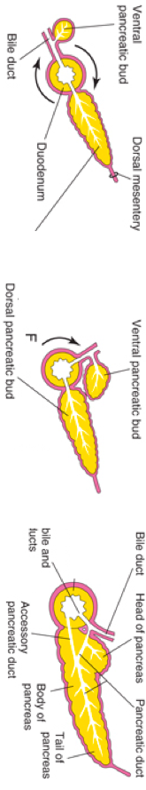 2) As the duodenum rotates to the right and becomes C-shaped, the ventral bud moves dorsally (together with the entrance of the common bile duct into the duodenum) and comes to lie below and behind the dorsal bud.