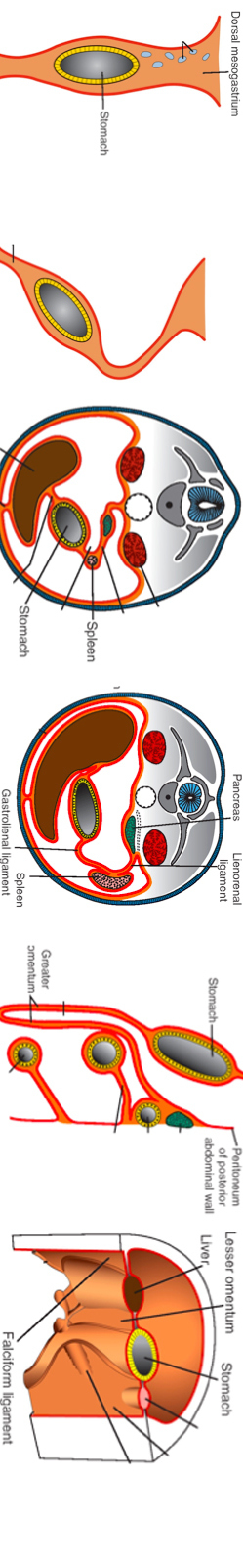 6) As a result of the rotation of the stomach about the anteroposterior axis, the dorsal mesentery of the stomach bulges down and continues to extend downwards as a four–layered greater omentum - These four layers fuse together and also fuse with the mesentery of the transverse colon hanging from the greater curvature of the stomach.