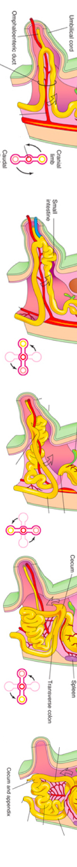 3) Because of the rapid growth of the midgut, the gut normally herniates into the umbilical cord during the 6th week. The midgut rotates anticlockwise for 90 degrees about the axis of the superior mesenteric artery during herniation.