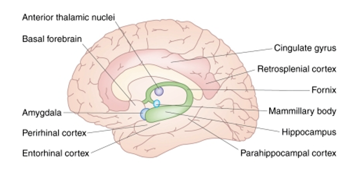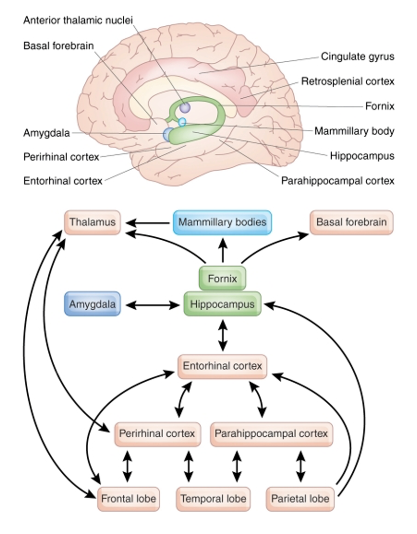 Fornix (connects to Mamillary bodies, thalamus, basal forebrain)