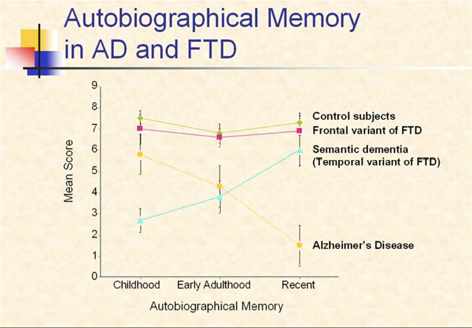 In Semantic FTD (fronto-temp) - where the temporal lobe is affected most - the opposite is seen where recent memory is alright but childhood memory is affected most