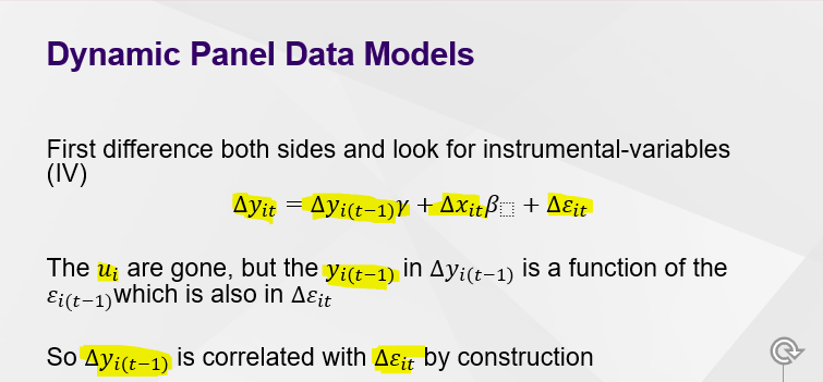 The standard approach applies the first difference (FD) transformation, which removes the unobserved fixed effect at the cost of introducing a correlation between ∆y(i,t-1) and the difference error term(∆vit,) both of which have a term dated (t − 1).