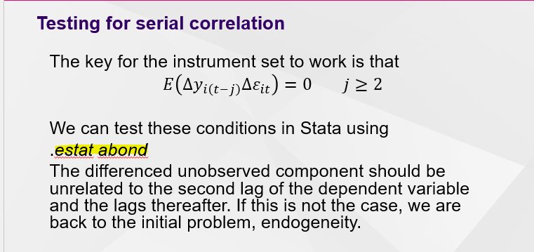 How do we test if the second-order lags and further are serially correlated via Stata?