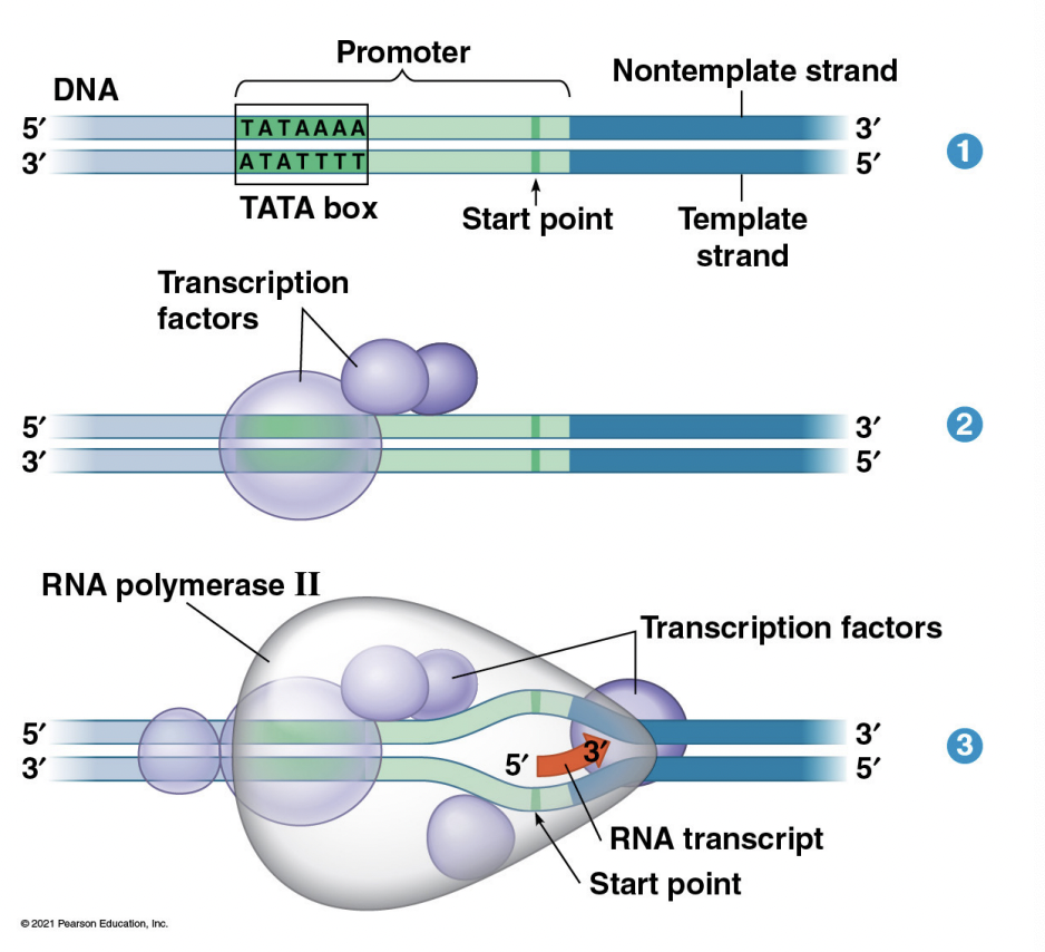-Transcription factors bind onto TATA box and promoter