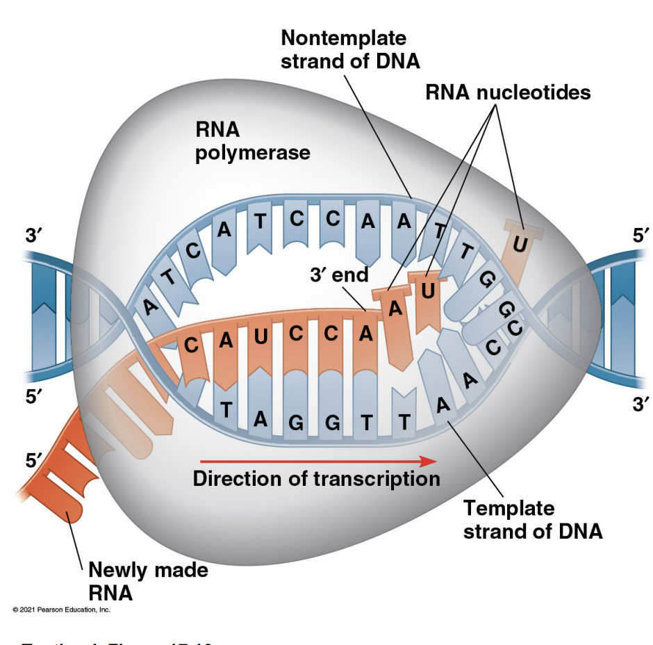 -RNA pol II uses template strand, and inserts complementary RNA nucleotides in 5’-3’ directions