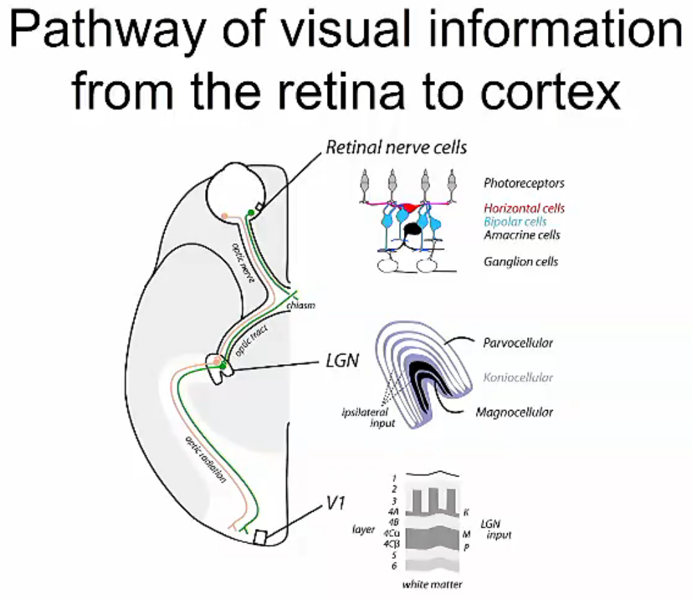 What are the three regions that the visual pathway goes through when going from the retina to the cortex