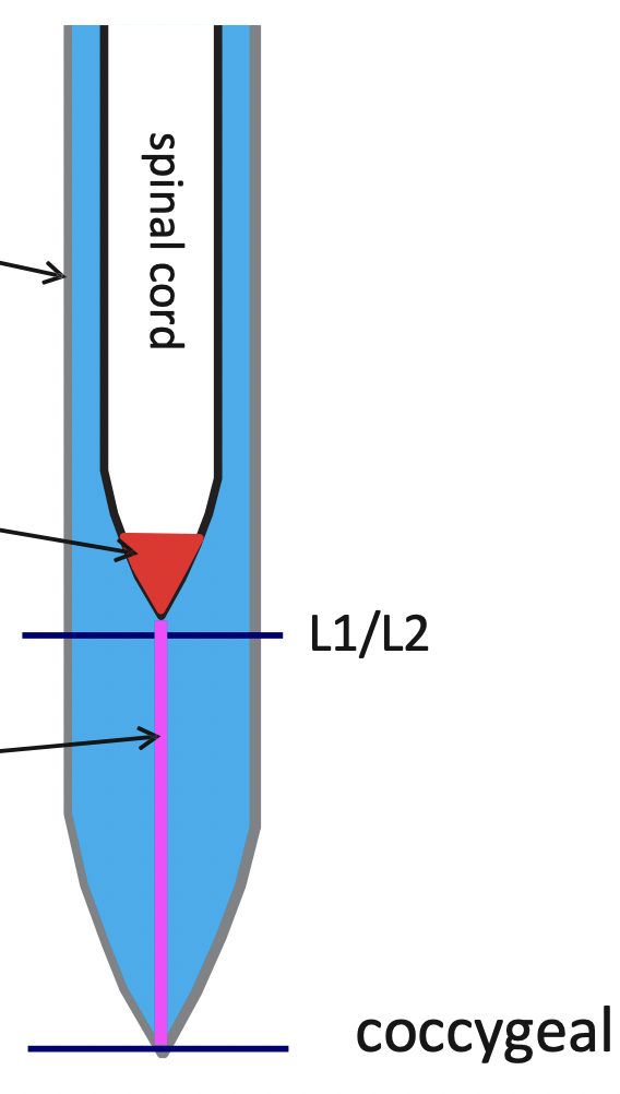 -Filum terminale: extends from conus medularis to end of spinal cavity (Coccygeal)
