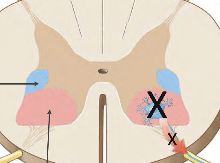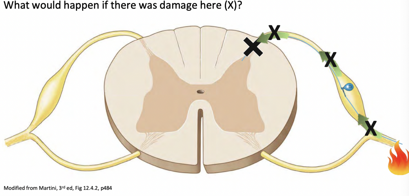 loss of sensation from regions of body supplied by sensory neurons from this spinal cord segment on same side only