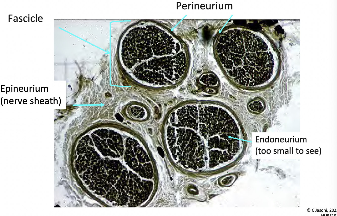 smalles to largest: Axon, Endo, Fasicle, Peri, Nerve, Epi